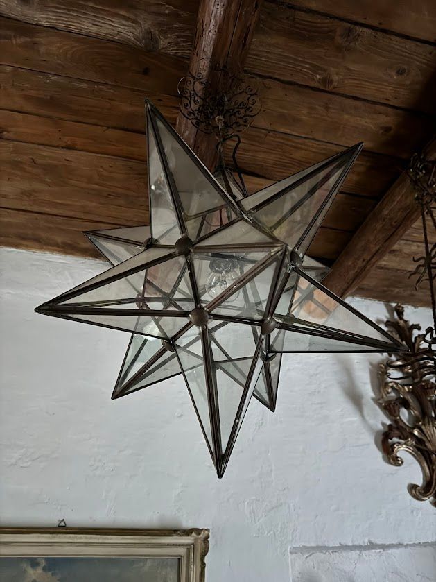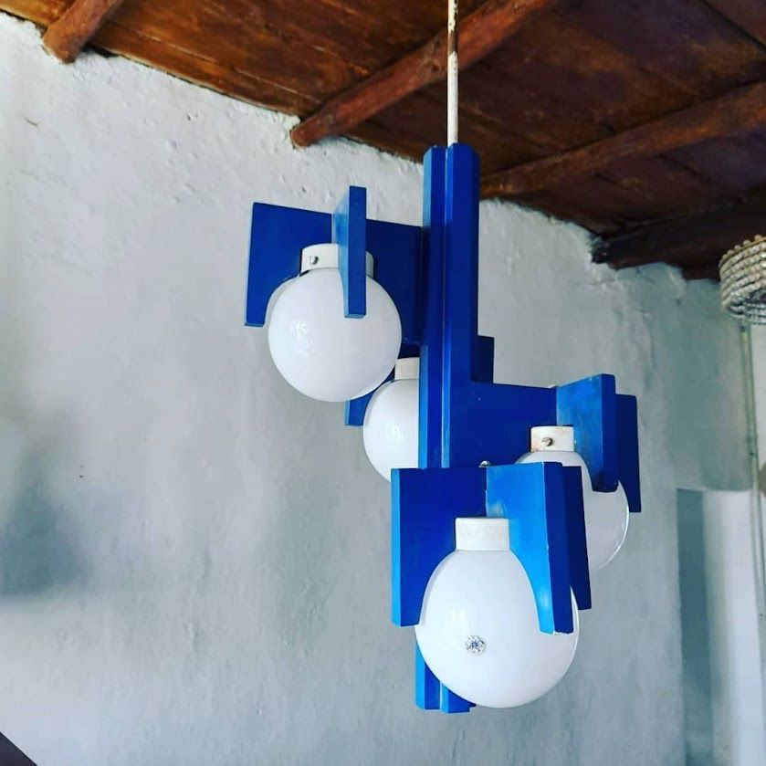 Lampada da soffitto in legno verniciato blu con vetri murano