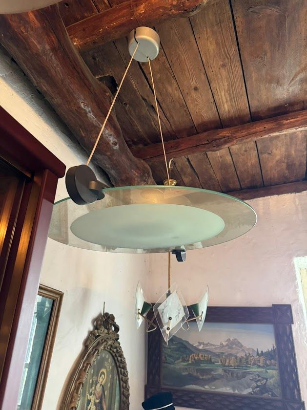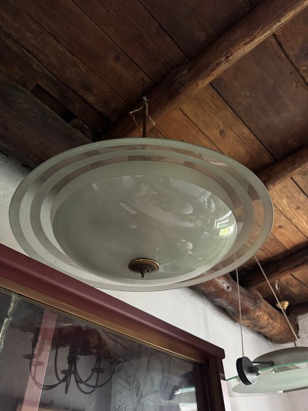 Lampada di design Cyclos di Michele De Lucchi per Artemide, in vetro lucido e satinato, con tiranti per l'attacco al soffitto.